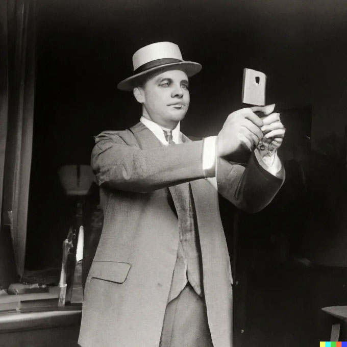 Ảnh tạo ra từ Dall-E 2 với mô tả: “Hình ảnh đen trắng về một người đàn ông đang chụp ảnh tự sướng những năm 1920”. (Ảnh: Kevin Roose)